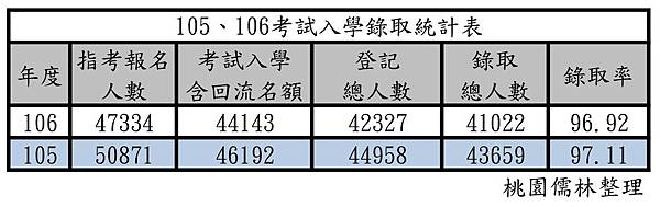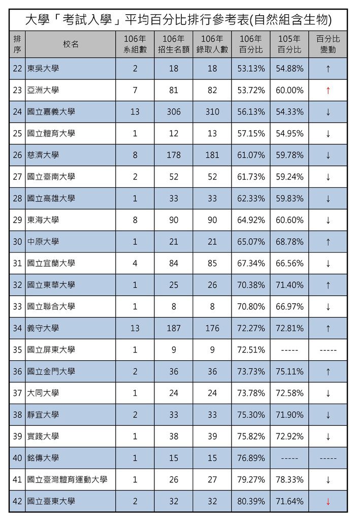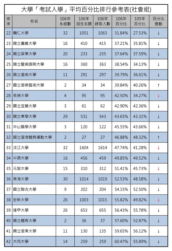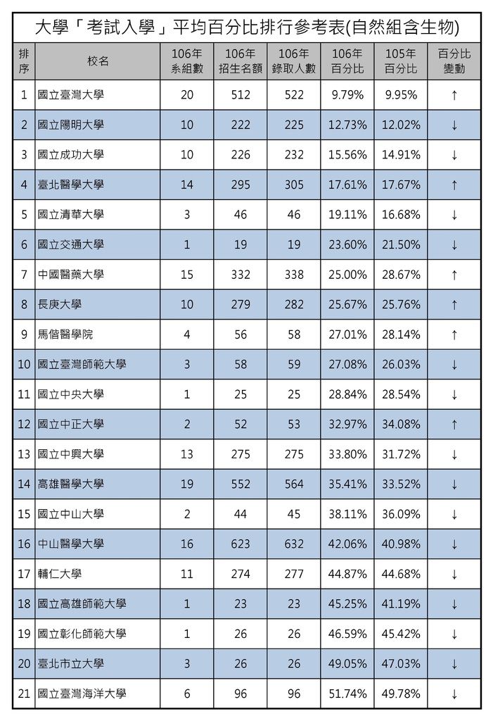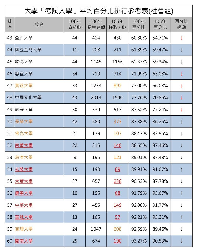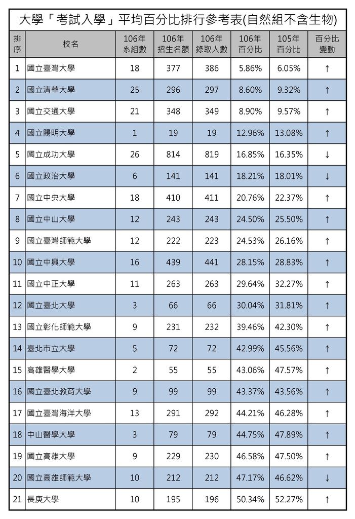 大學分類組「考試入學」平均百分比106、105年排行參考表