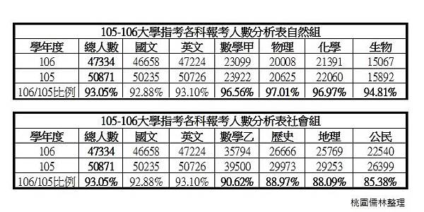 106年的指考百分比出現不同類組上升、下降不同調的現象,一類組下降的學校最多,三類組次之,而二類組卻以上升學校較多,我們把大考中心公布的各科報考人數,拿106年與105年比較,可以看到今年相對於去年的總報考人數比例為93.05%,等於減少7%,而國、英兩科相當,但是自然組的數學甲比例為96.56%,等於只減少3.5%;物理跟化學也只減少3%,代表二類組今年減幅較小,而三類組的生物減幅約5.2%,大於二類組,但少於全體;減少最大的是社會組,主要代表的歷史跟地理兩科減幅高達達11到12%。