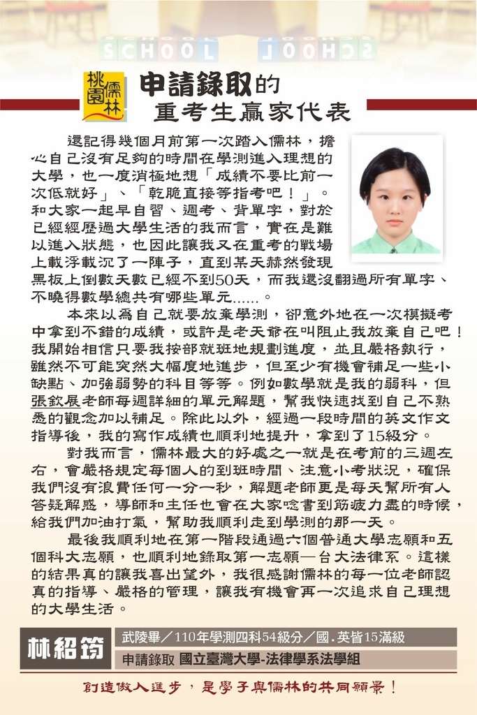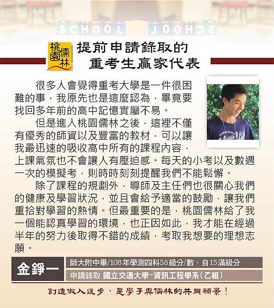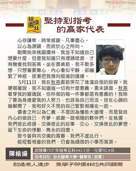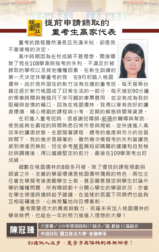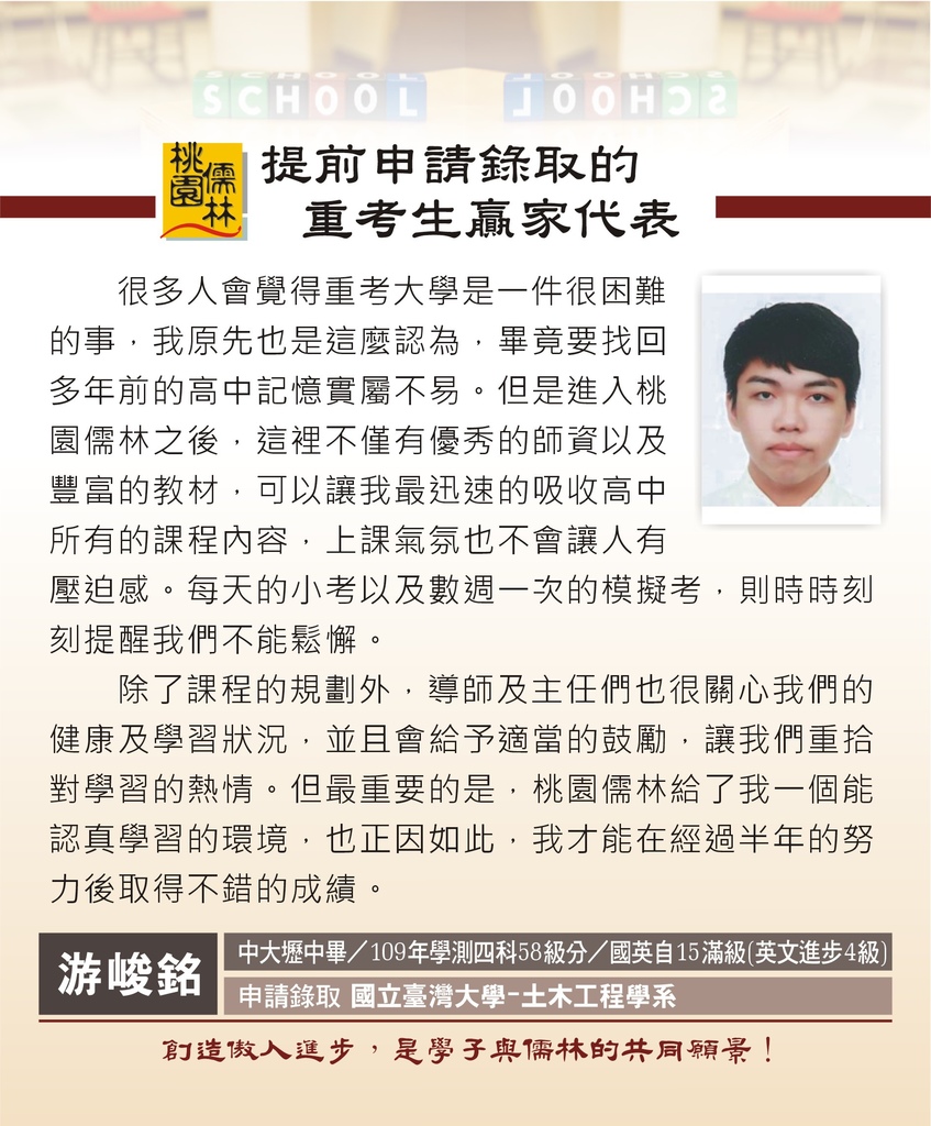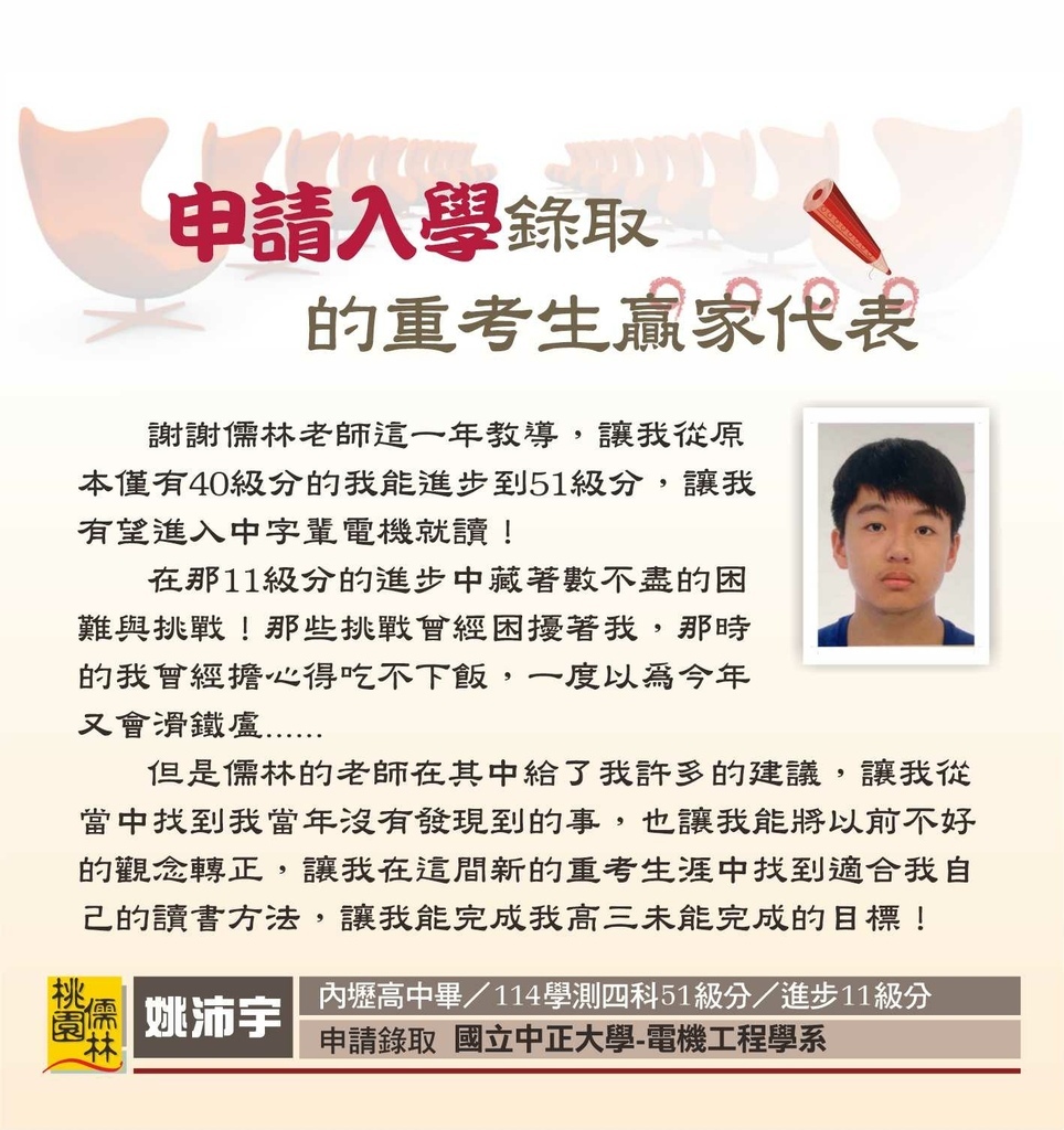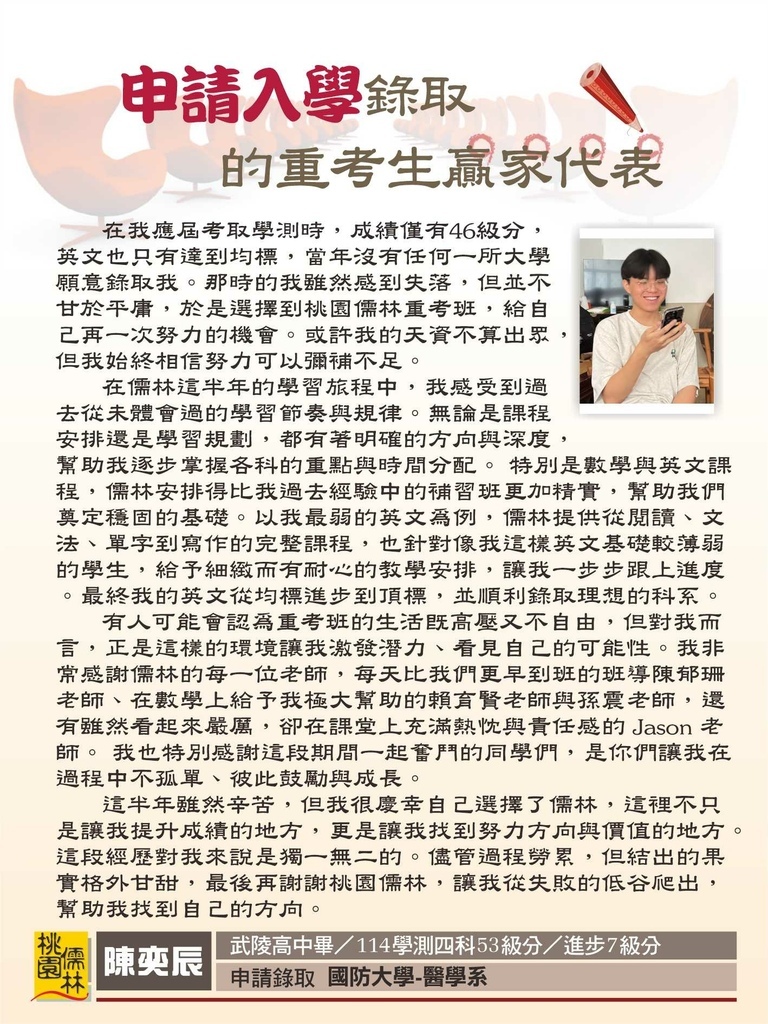 從指考2百多分進步到508分的重考奮發故事。主筆:桃園儒林學子詹宇翔