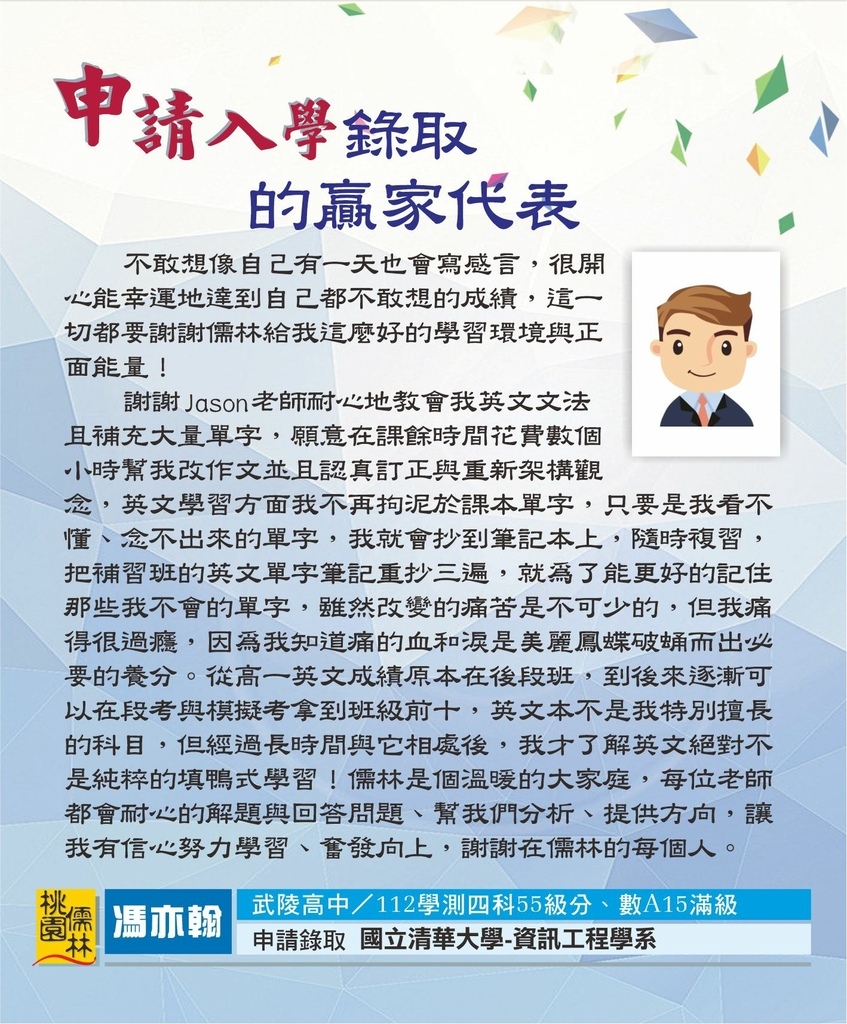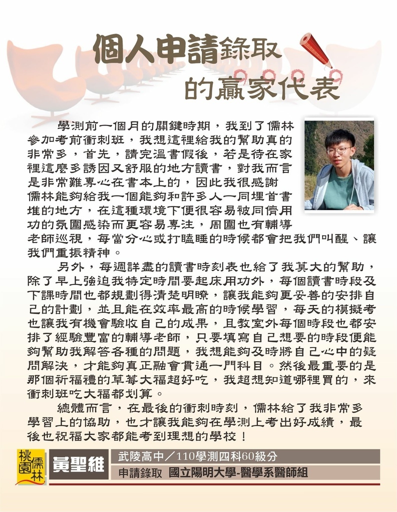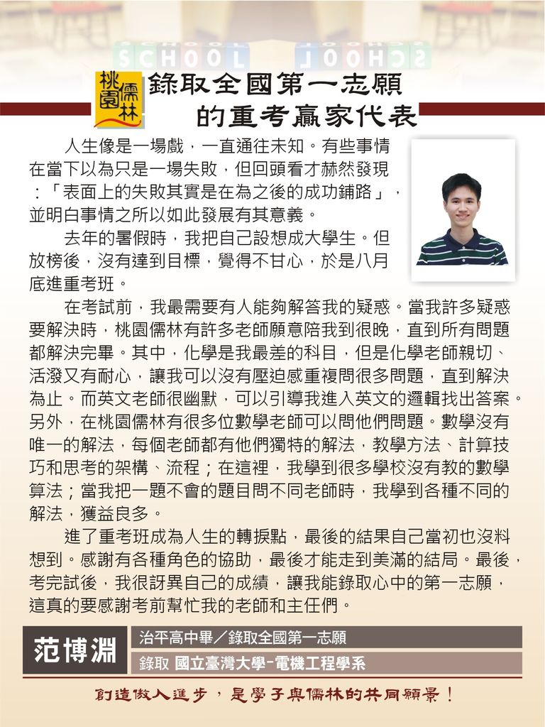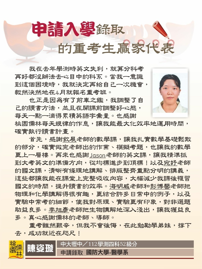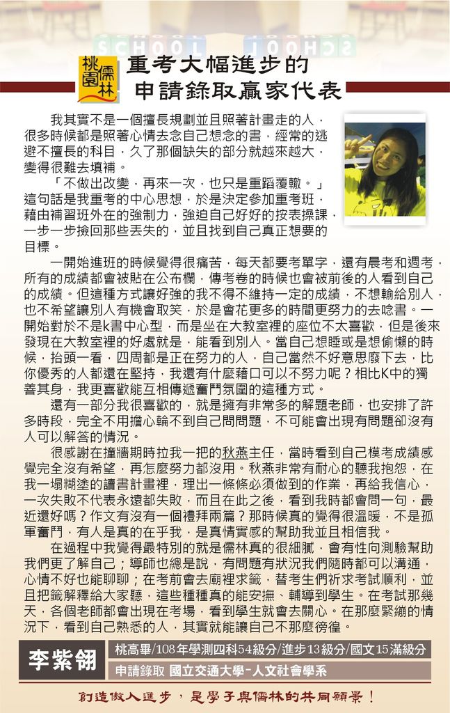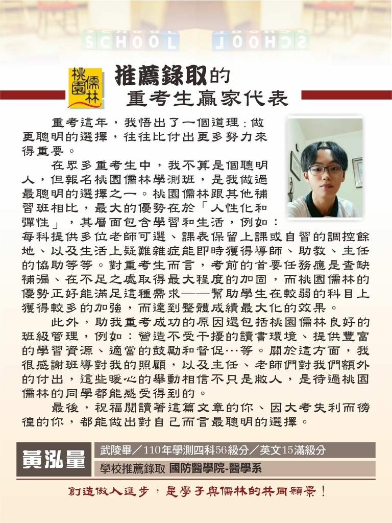 從指考2百多分進步到508分的重考奮發故事。主筆:桃園儒林學子詹宇翔
