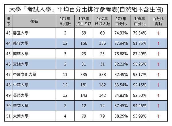 | 今去年考試入學平均百分比,相差五個百分比以上之學校類組,於“百分比變動”該欄位以,"↓","↑"的紅字表示 |