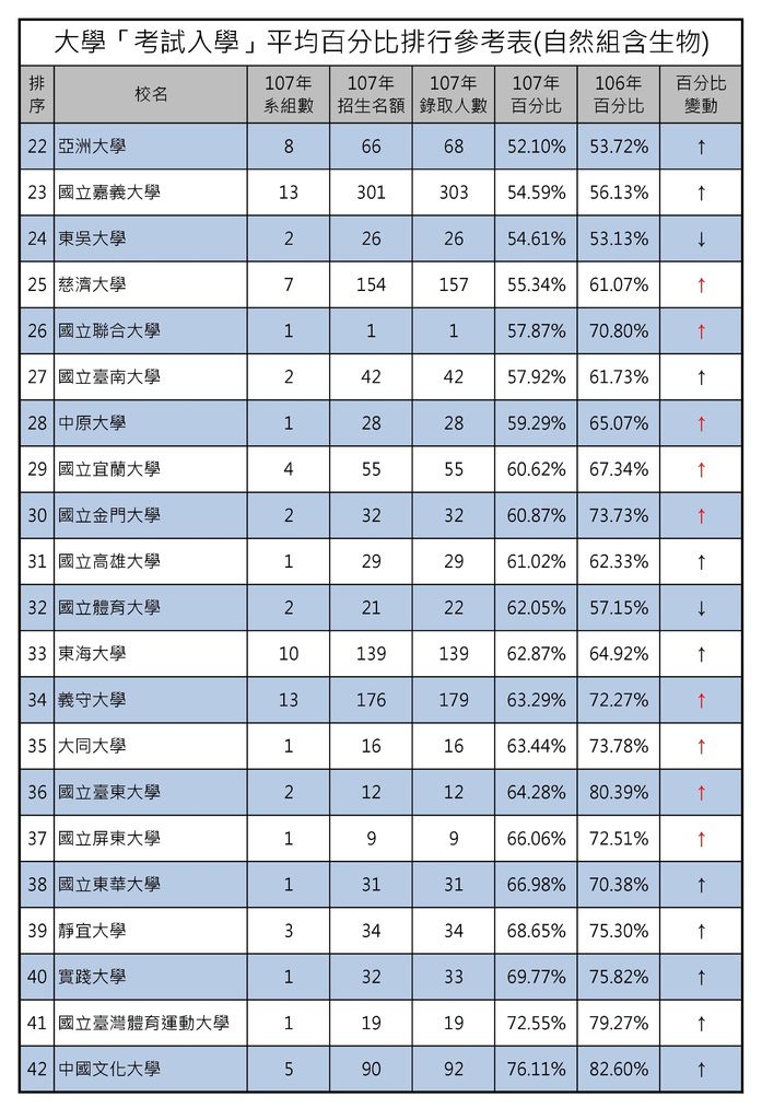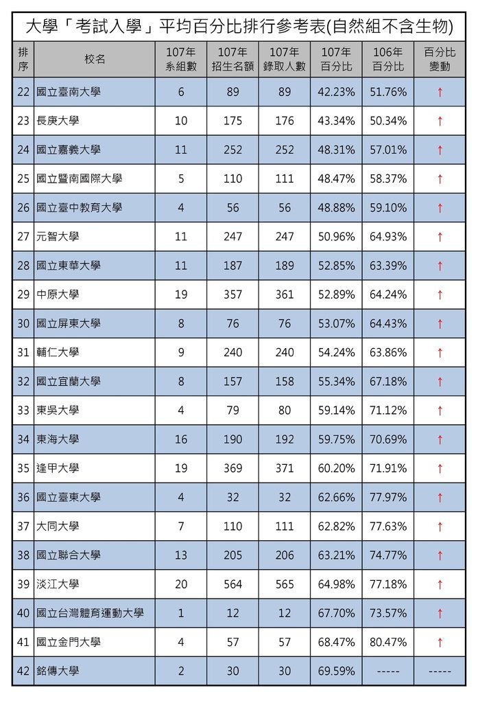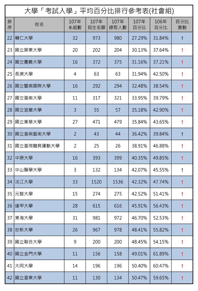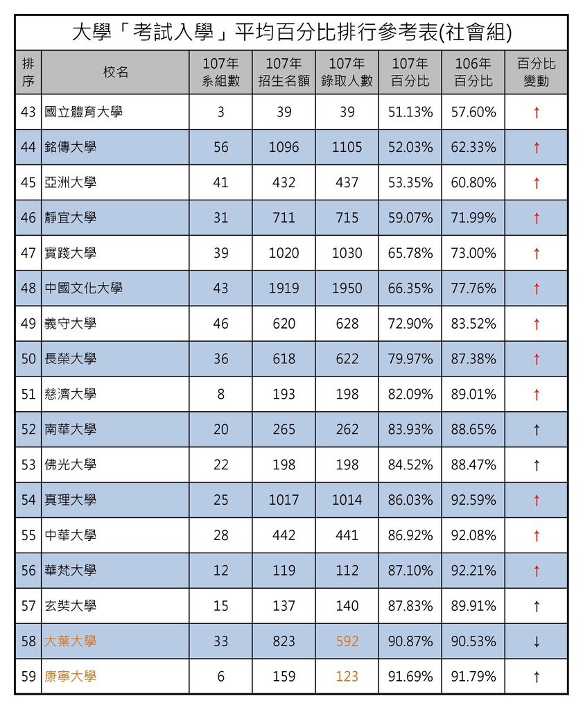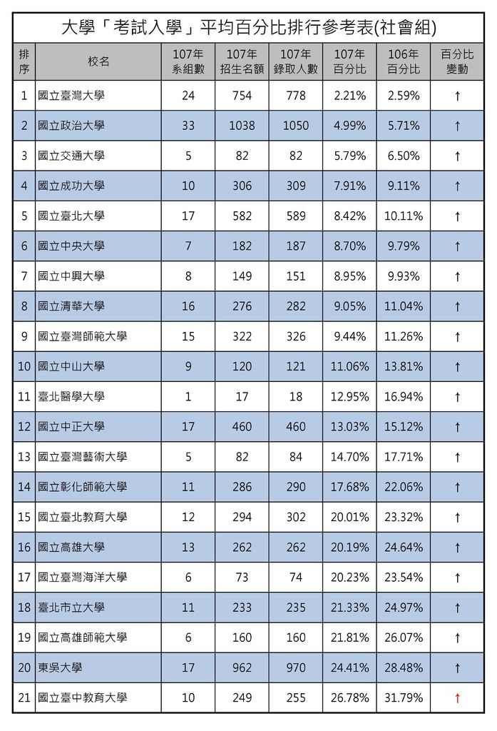 大學分類組「考試入學」平均百分比107、106年排行參考表