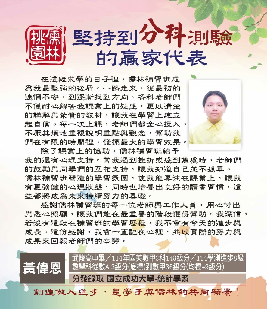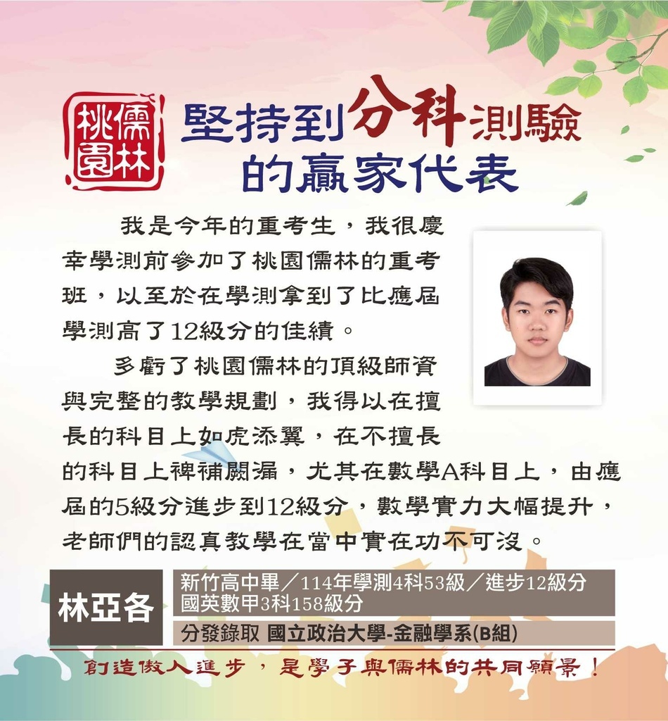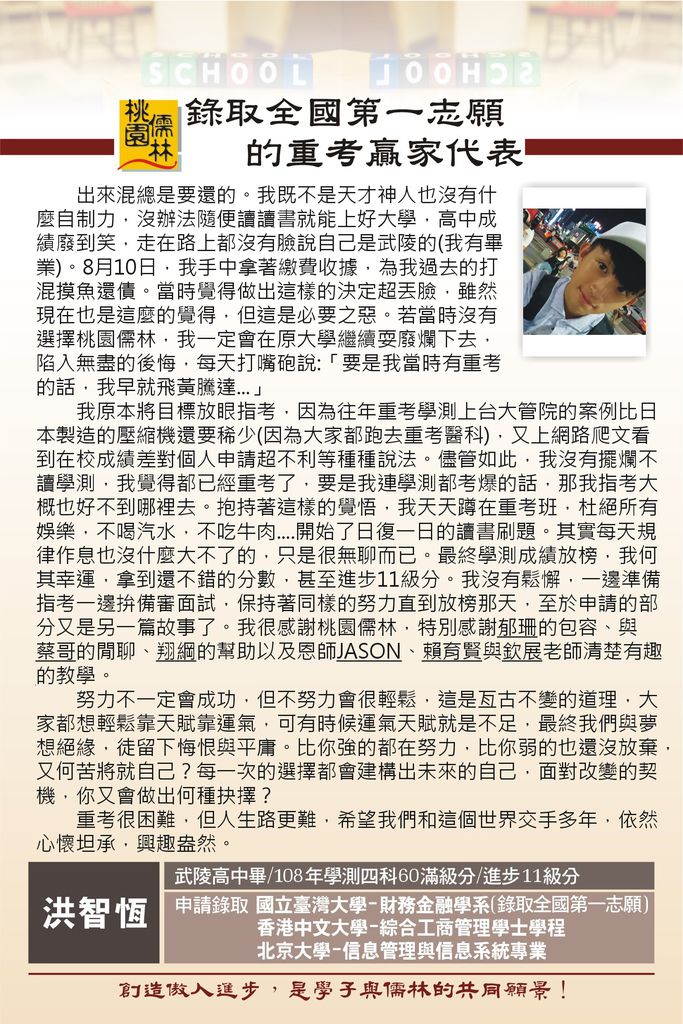 【重考學測大幅進步11級,考60滿級上臺大財金】桃園儒林學子洪智恆的奮發故事