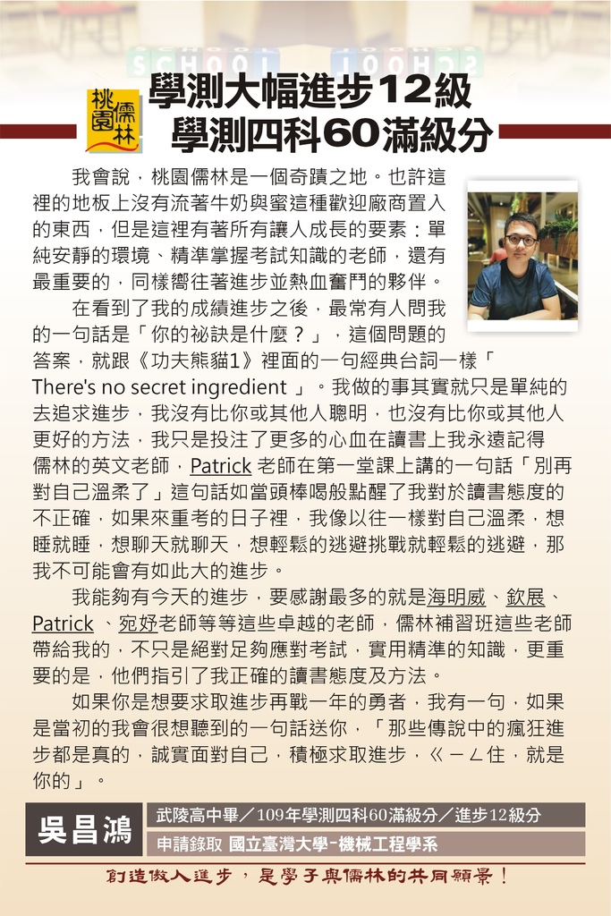 【重考學測大幅進步12級,60滿級申請上臺大機械】學子吳昌鴻在桃園儒林躍進的讀書方法