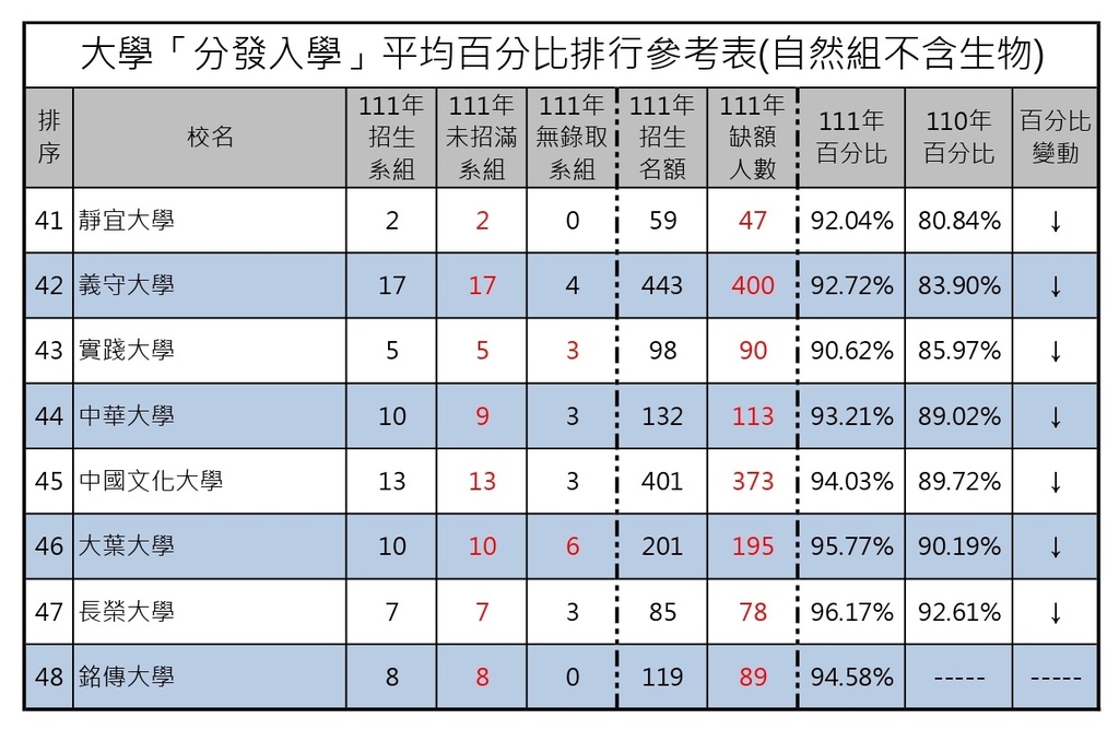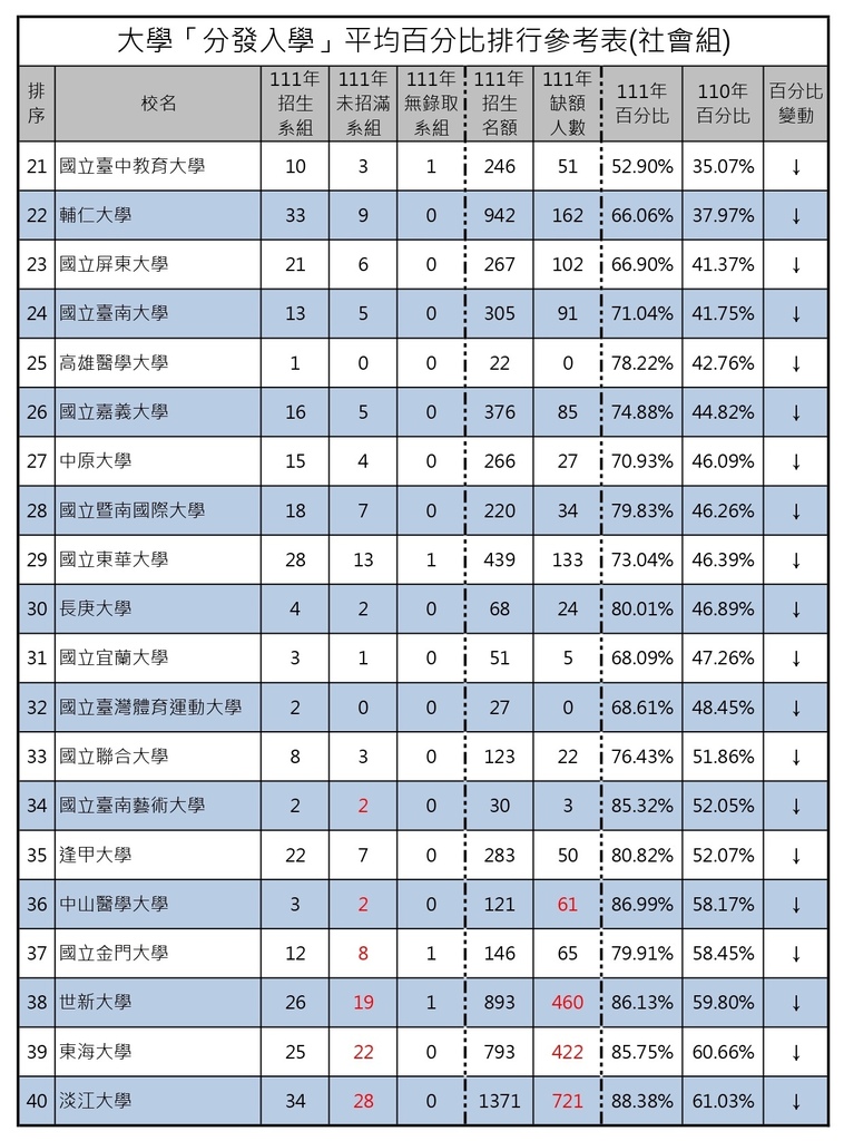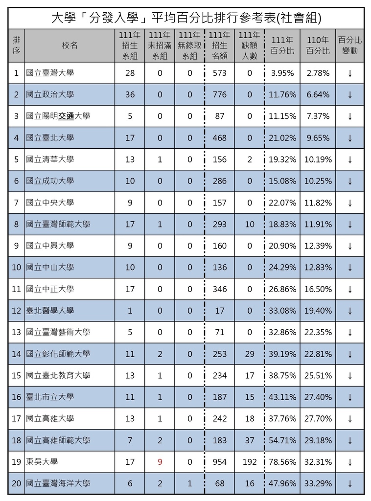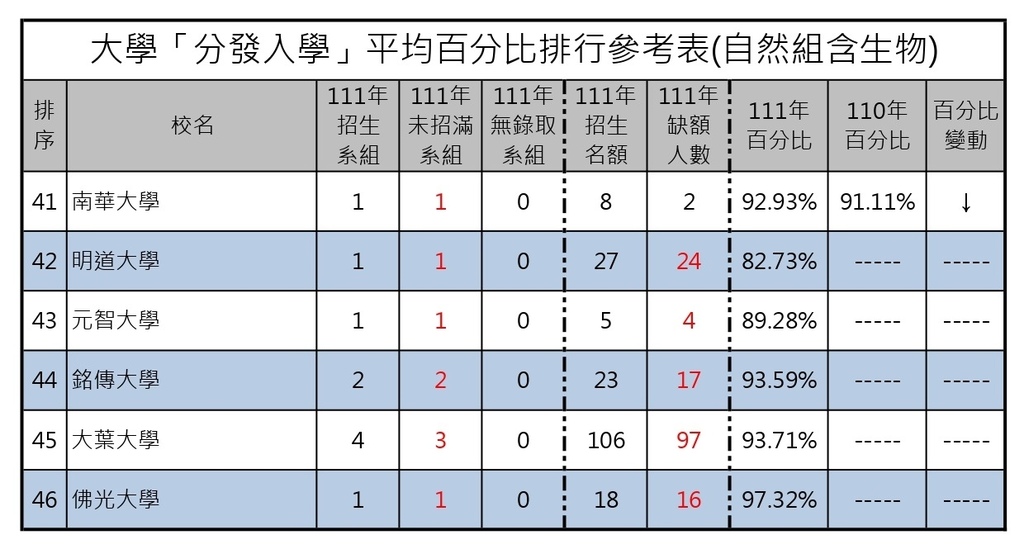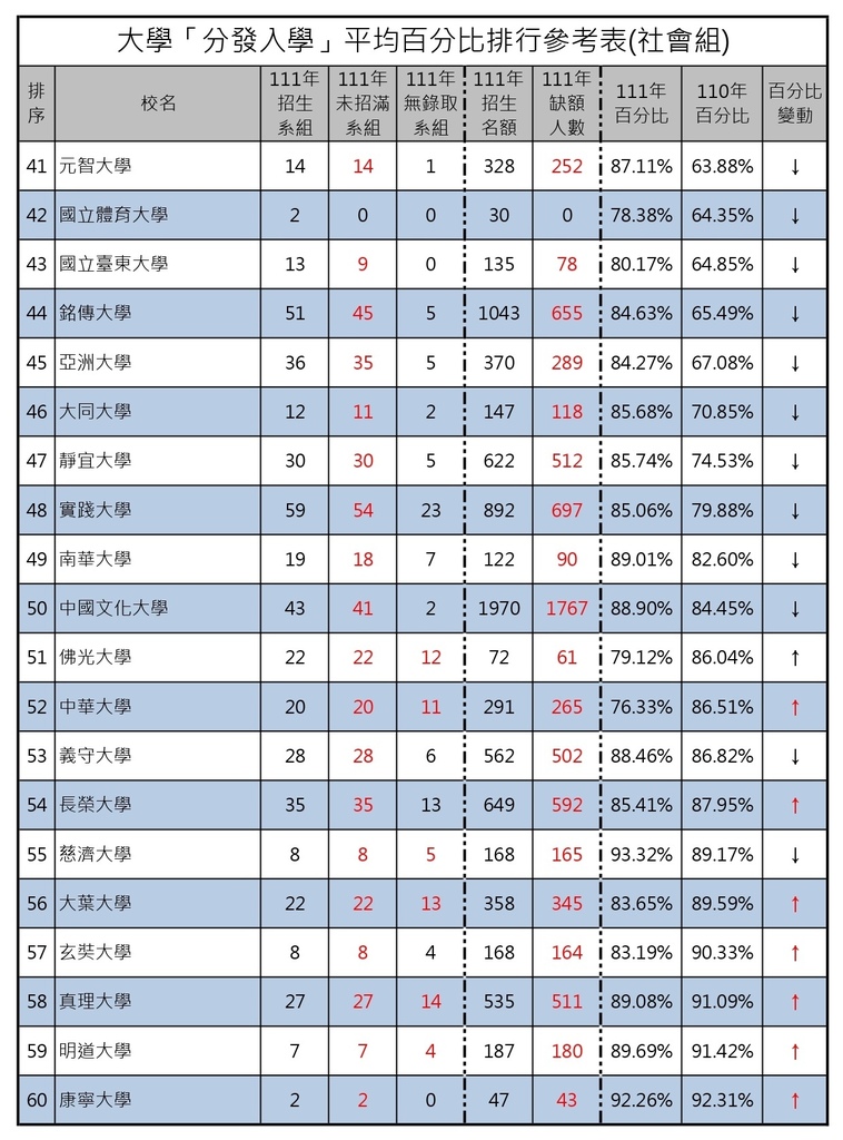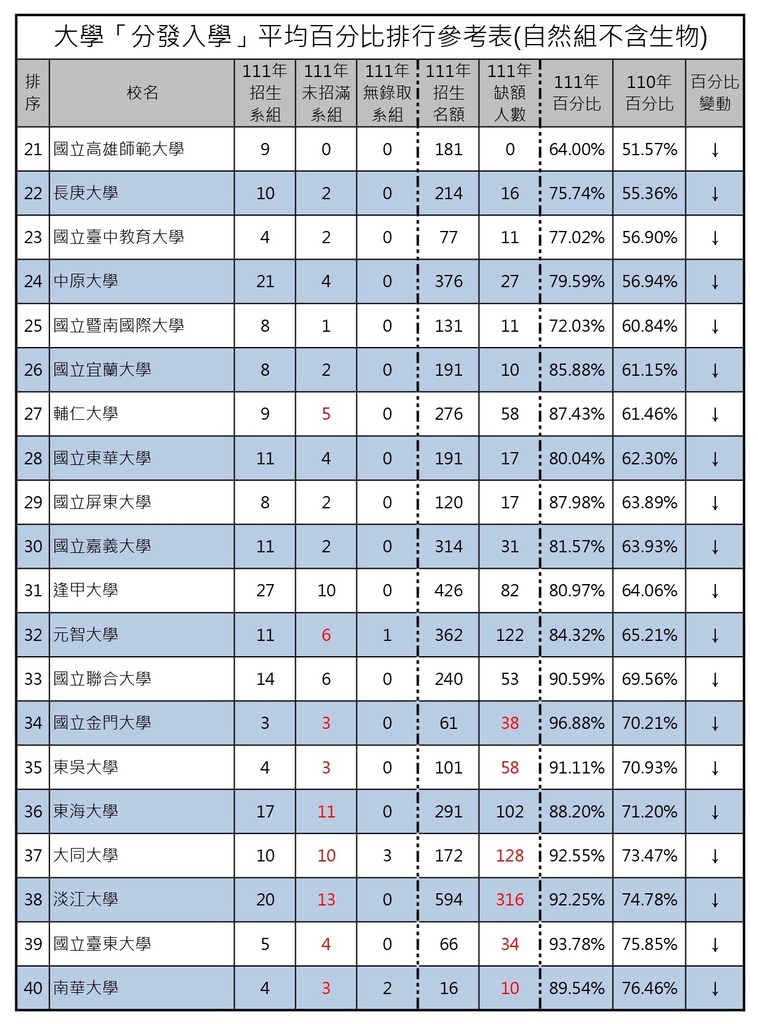 111年分發入學因為出現14493個大量缺額,招生缺額率超過80%的大學高達12所,所以錄取平均百分比出現嚴重下滑,像是政大社會組從110年的6.64%掉到111年的11.76%;台大自然組含生物從110年的11.35%掉到111年的18.16%;但部分招生缺額甚高的校系,有可能有全系組未招到人,或是所招到學生甚少,讓錄取平均百分比失真,例如康寧社會組有兩個系組用分發入學招生,原定要招47人,最後兩個系組只招到4個人;再如元智自然組含生物有一個系組用分發入學招生。原定要招5人,最後只招到1人,而這錄取百分比就是那一位同學的還原總分百分比;再如111年有少數學校的錄取百分比反向上升,觀其細節,皆是因為出現大量招生缺額,例如中華大學社會組用分發入學招生有20個系組,原定要招291個學生,但最後只有9個系組招到學生,共只招到26人,這9個系的錄取平均百分比為76.33%,反較110年為高,所以可見後段學校失真很嚴重。所以我們的排行仍用110年的百分比來排序,並將111年未招滿系組、無錄取系組、缺額人數都標示出來,方便讀者了解。