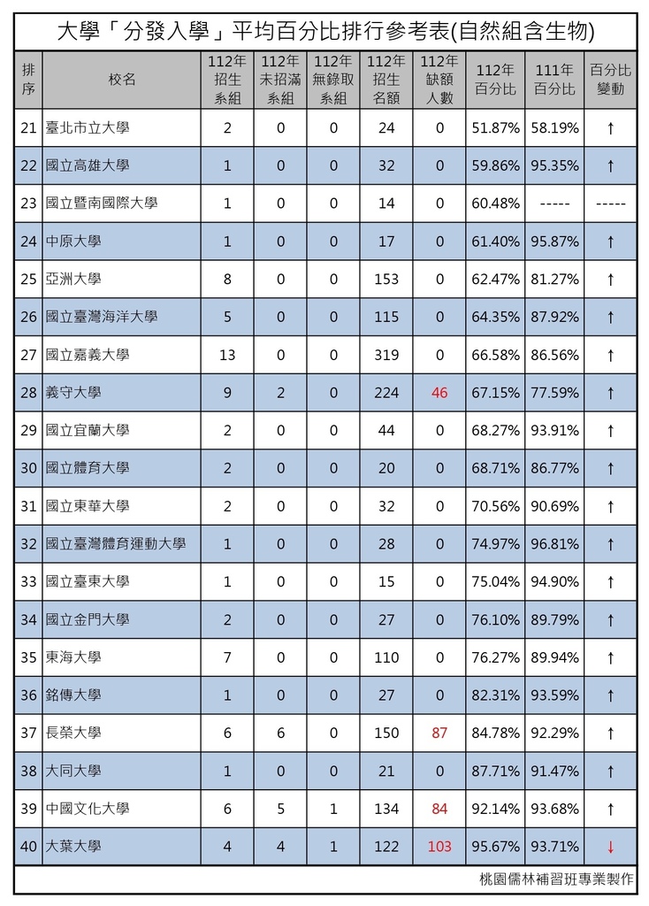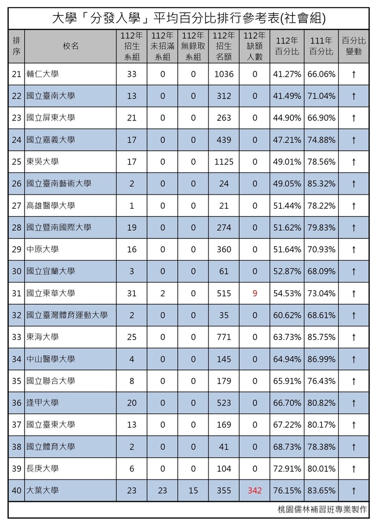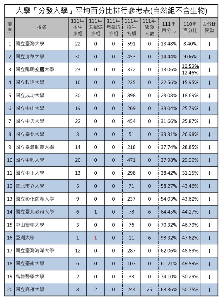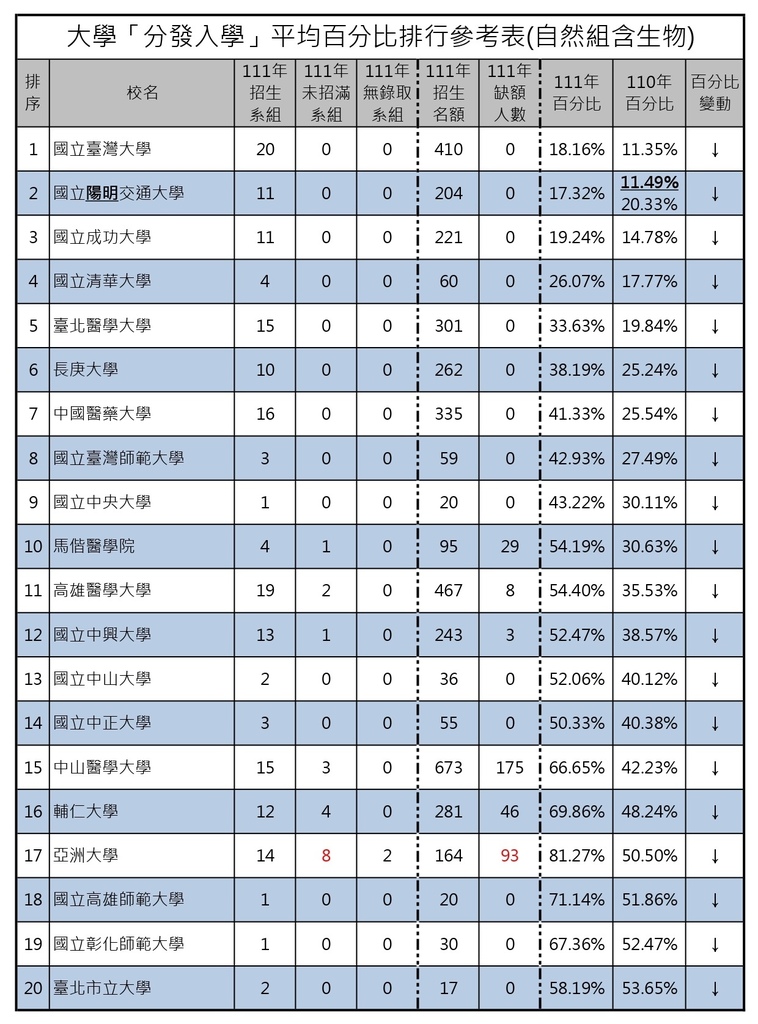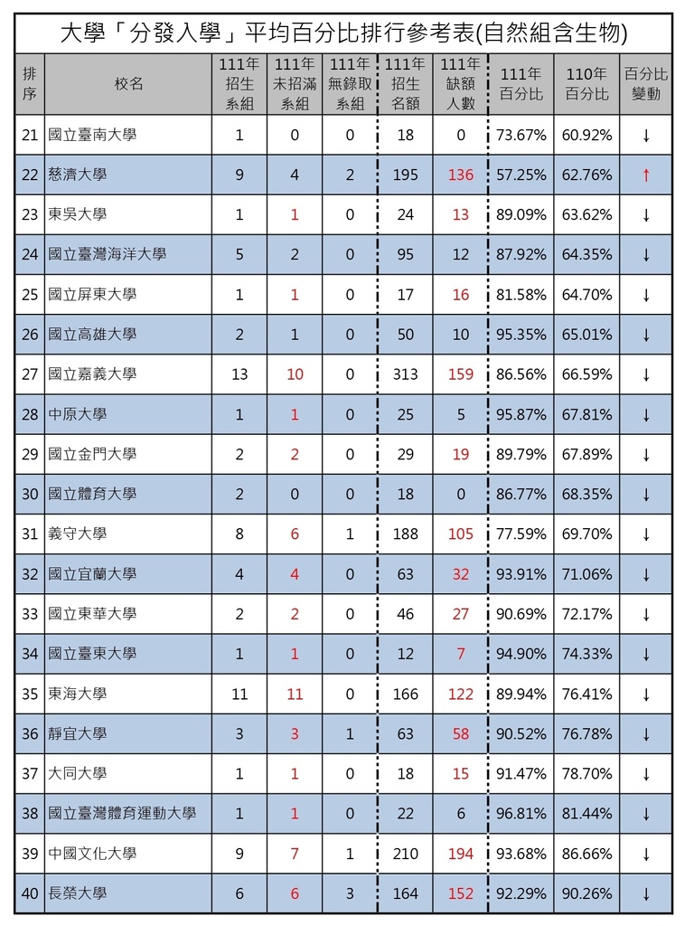 111年分發入學因為出現14493個大量缺額,招生缺額率超過80%的大學高達12所,所以錄取平均百分比出現嚴重下滑,像是政大社會組從110年的6.64%掉到111年的11.76%;台大自然組含生物從110年的11.35%掉到111年的18.16%;但部分招生缺額甚高的校系,有可能有全系組未招到人,或是所招到學生甚少,讓錄取平均百分比失真,例如康寧社會組有兩個系組用分發入學招生,原定要招47人,最後兩個系組只招到4個人;再如元智自然組含生物有一個系組用分發入學招生。原定要招5人,最後只招到1人,而這錄取百分比就是那一位同學的還原總分百分比;再如111年有少數學校的錄取百分比反向上升,觀其細節,皆是因為出現大量招生缺額,例如中華大學社會組用分發入學招生有20個系組,原定要招291個學生,但最後只有9個系組招到學生,共只招到26人,這9個系的錄取平均百分比為76.33%,反較110年為高,所以可見後段學校失真很嚴重。所以我們的排行仍用110年的百分比來排序,並將111年未招滿系組、無錄取系組、缺額人數都標示出來,方便讀者了解。