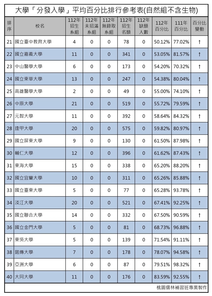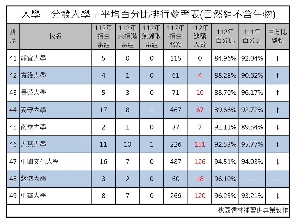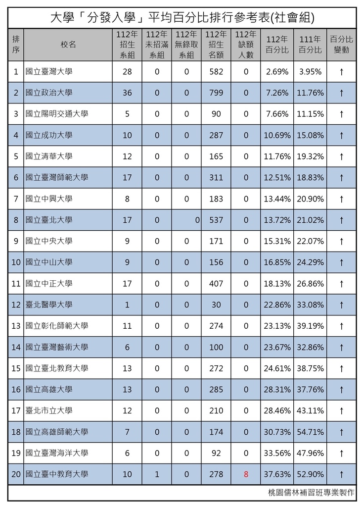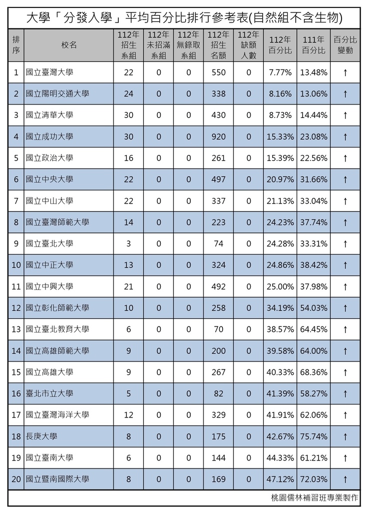 大學分類組「分發入學」平均百分比112、111年排行參考表