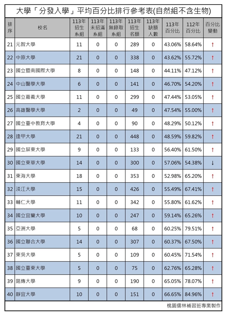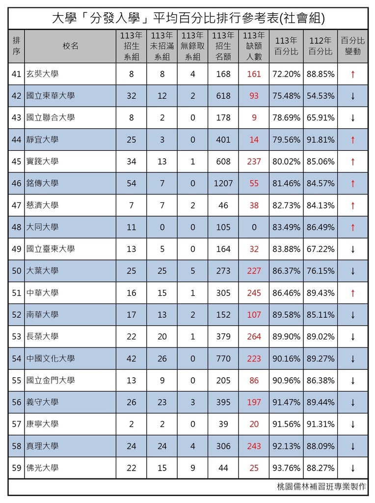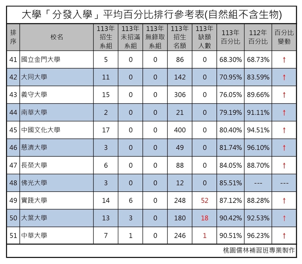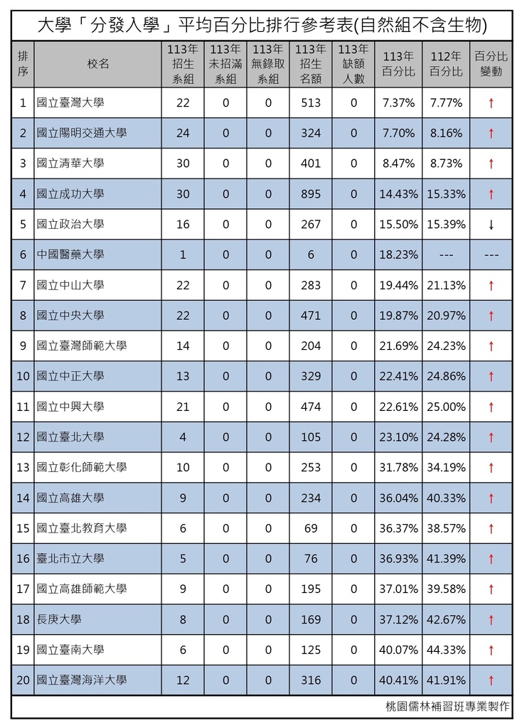 113年分發入學出現2505個招生缺額,招生缺額有向社會組後段學校集中的現象;113年分發入學相較於112年有6464個大量缺額情況大幅改善,自然組尤其明顯,所以自然組錄取平均百分比多出現明顯回升,如台大自然組含生物從112年的11.87%升到113年的11.56%。而社會組則各校情況不一,像是政大社會組從112年的7.26%,上升到113年的6.99%;清大社會組從112年的11.76%,下降到113年的12.17%。