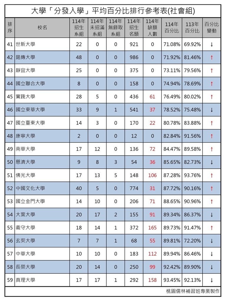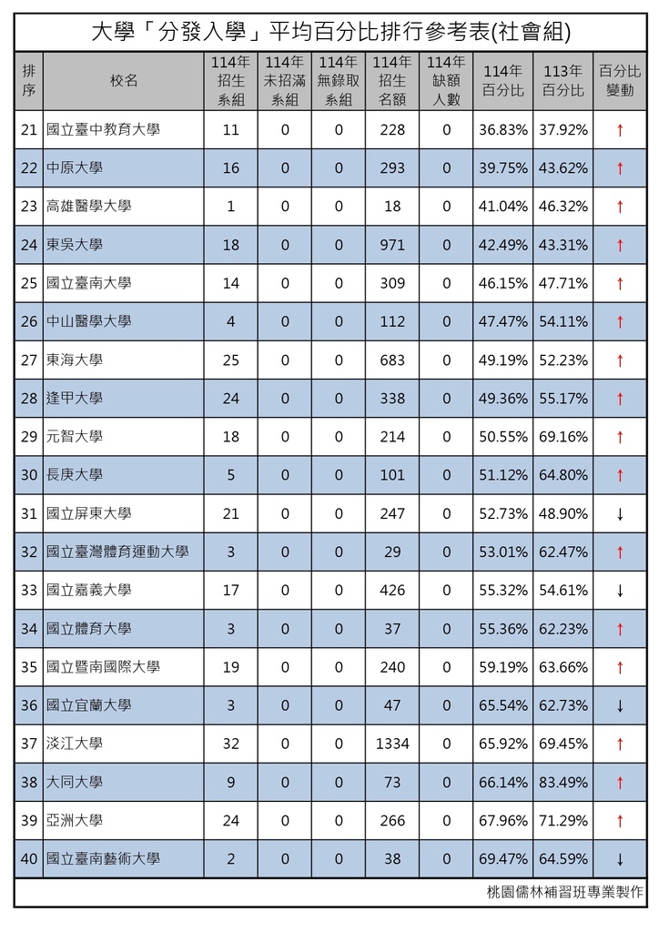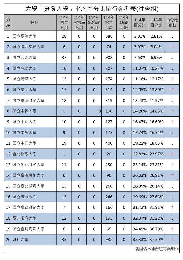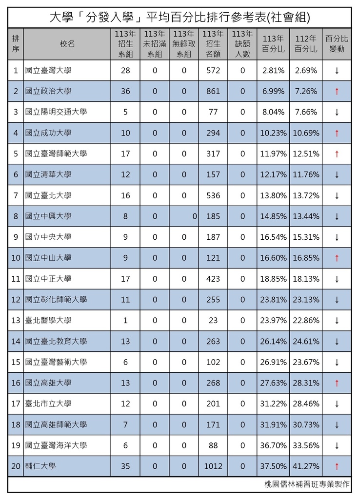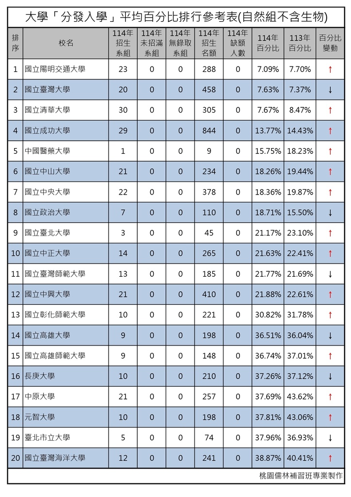 大學分類組「分發入學」平均百分比114、113年排行參考表