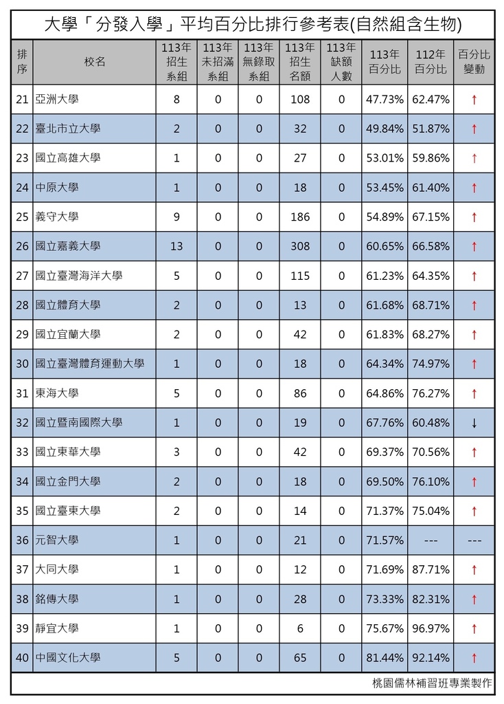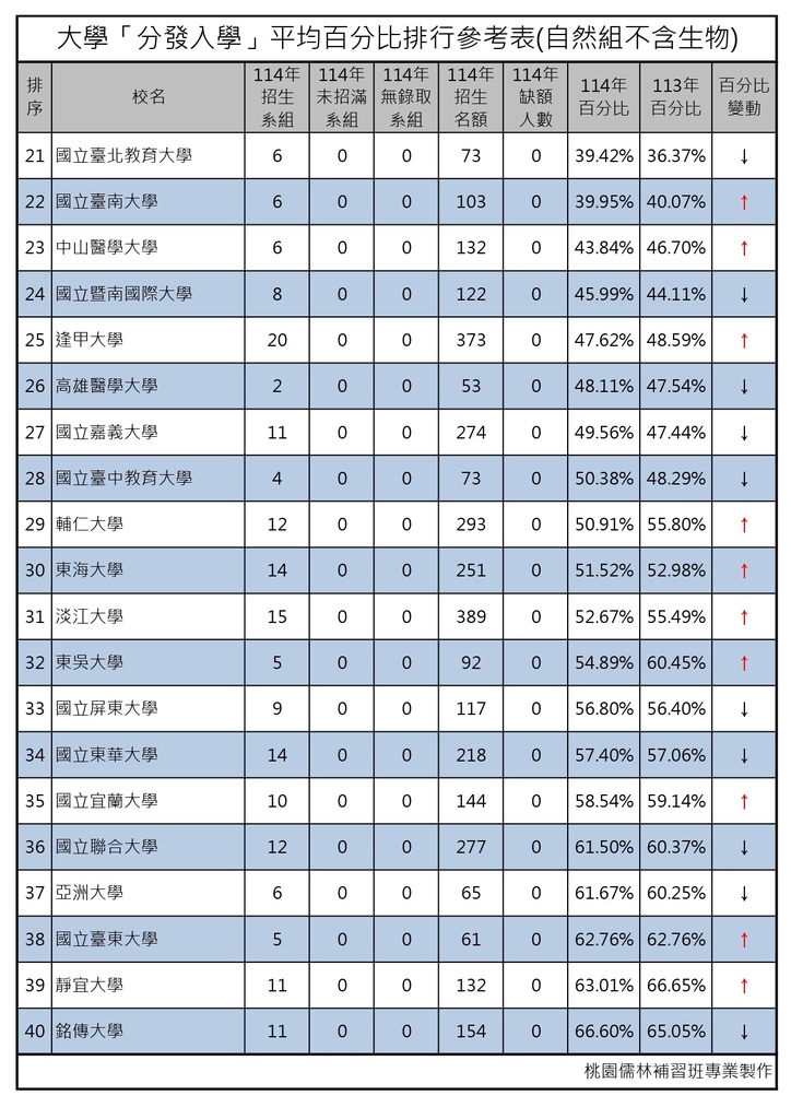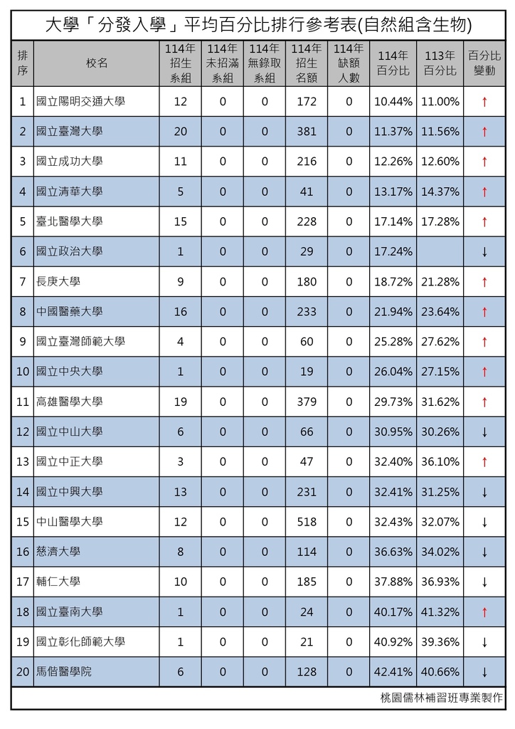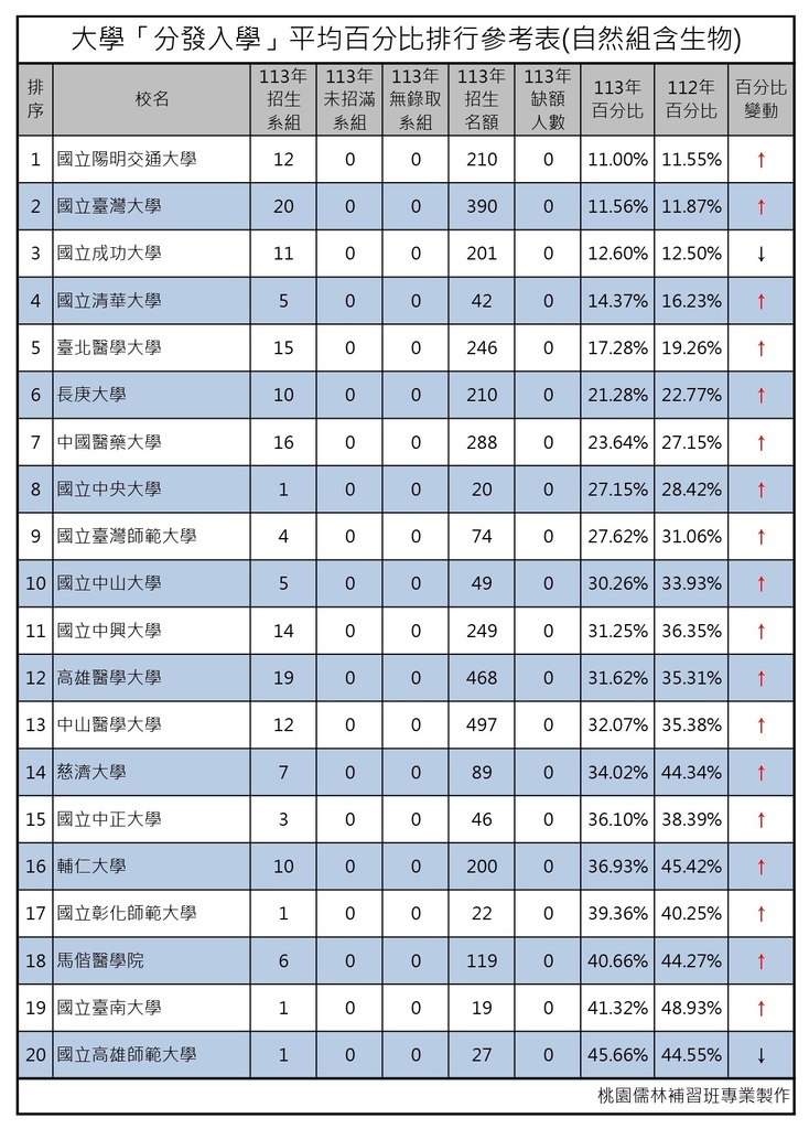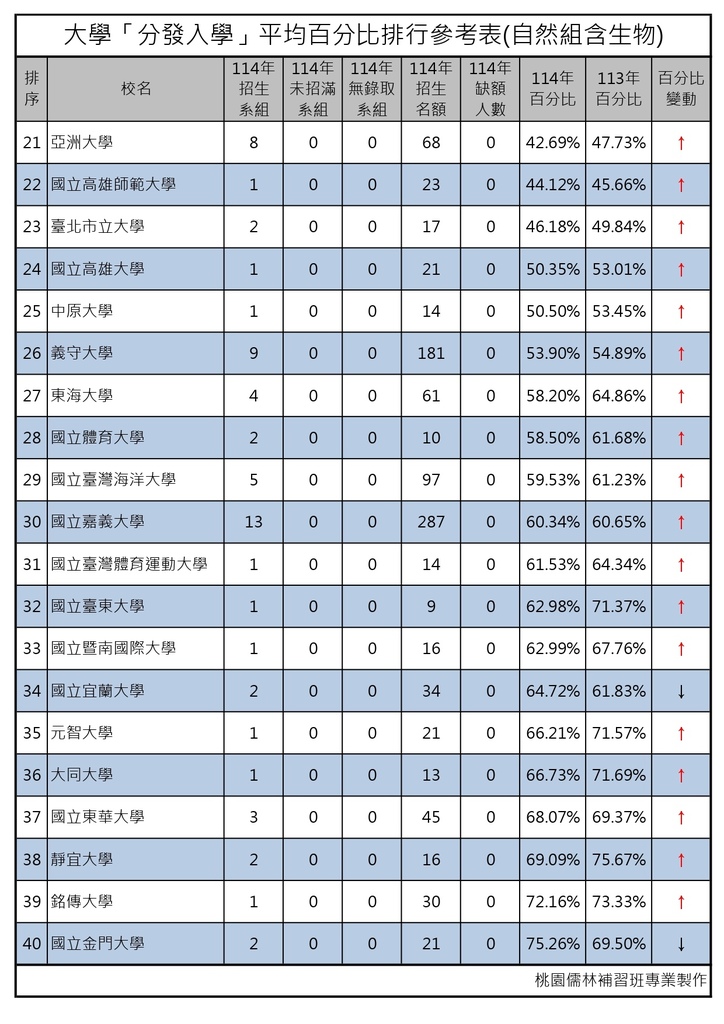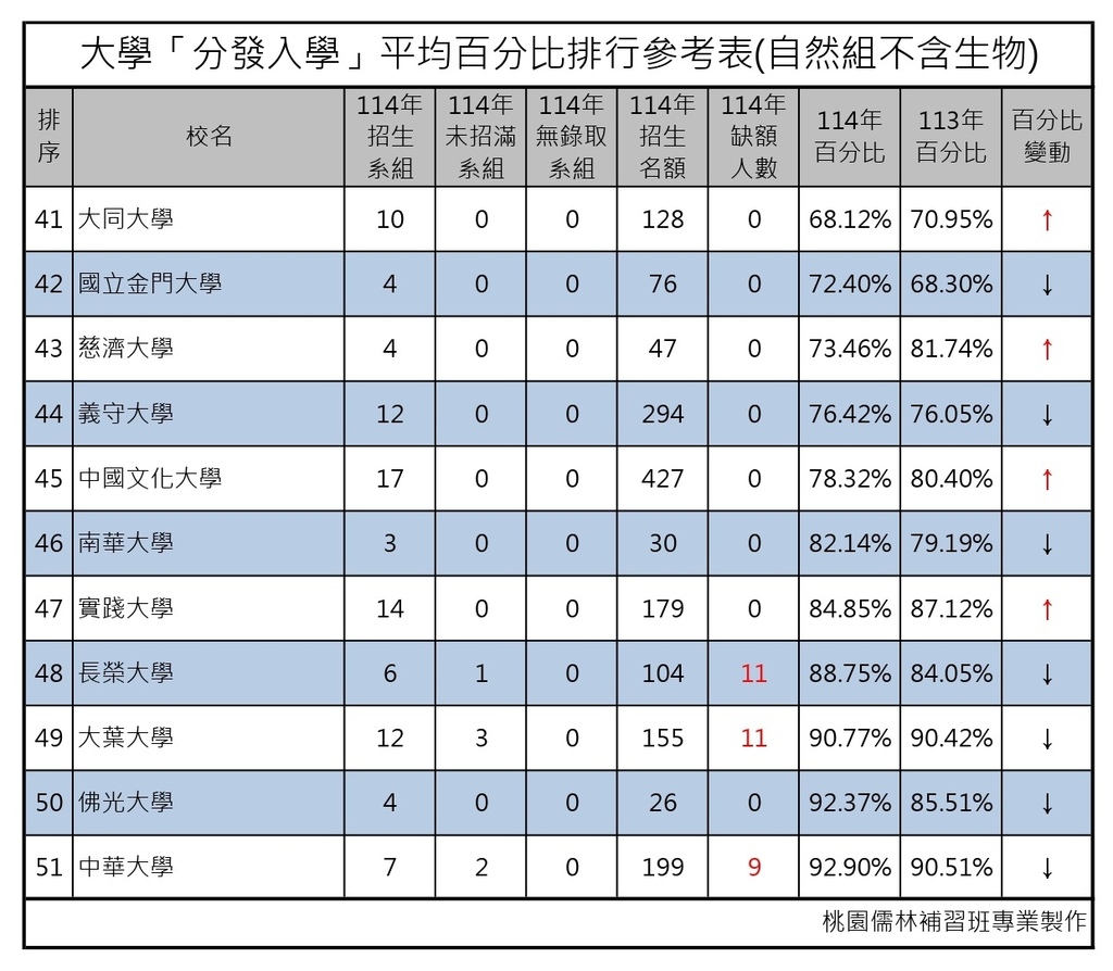 大學分類組「分發入學」平均百分比114、113年排行參考表