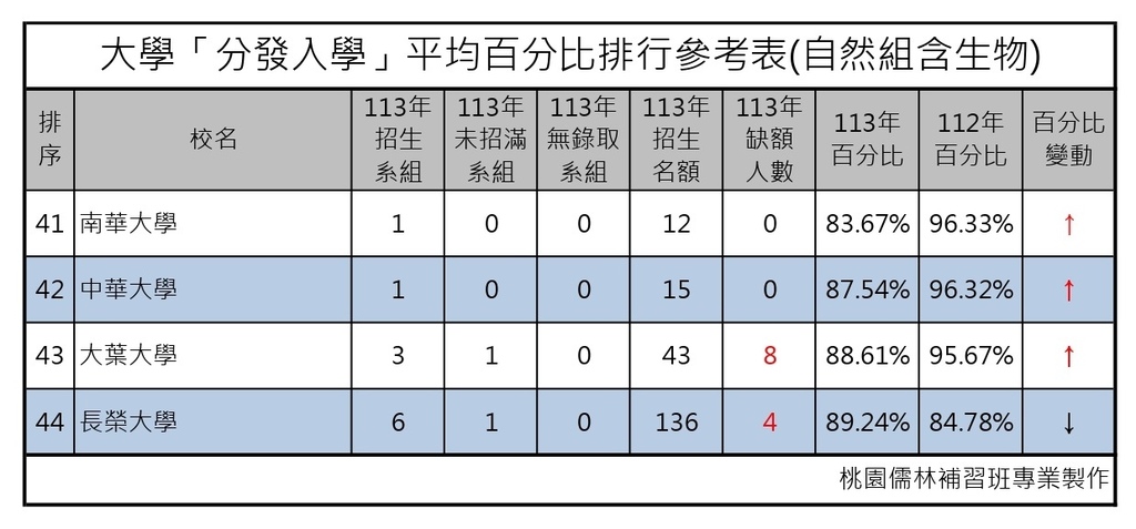 113年平均百分比「8.47 %」較112年的「8.73 %」小,代表變得相對難上,我們也用箭頭"↑"表示難度上升。