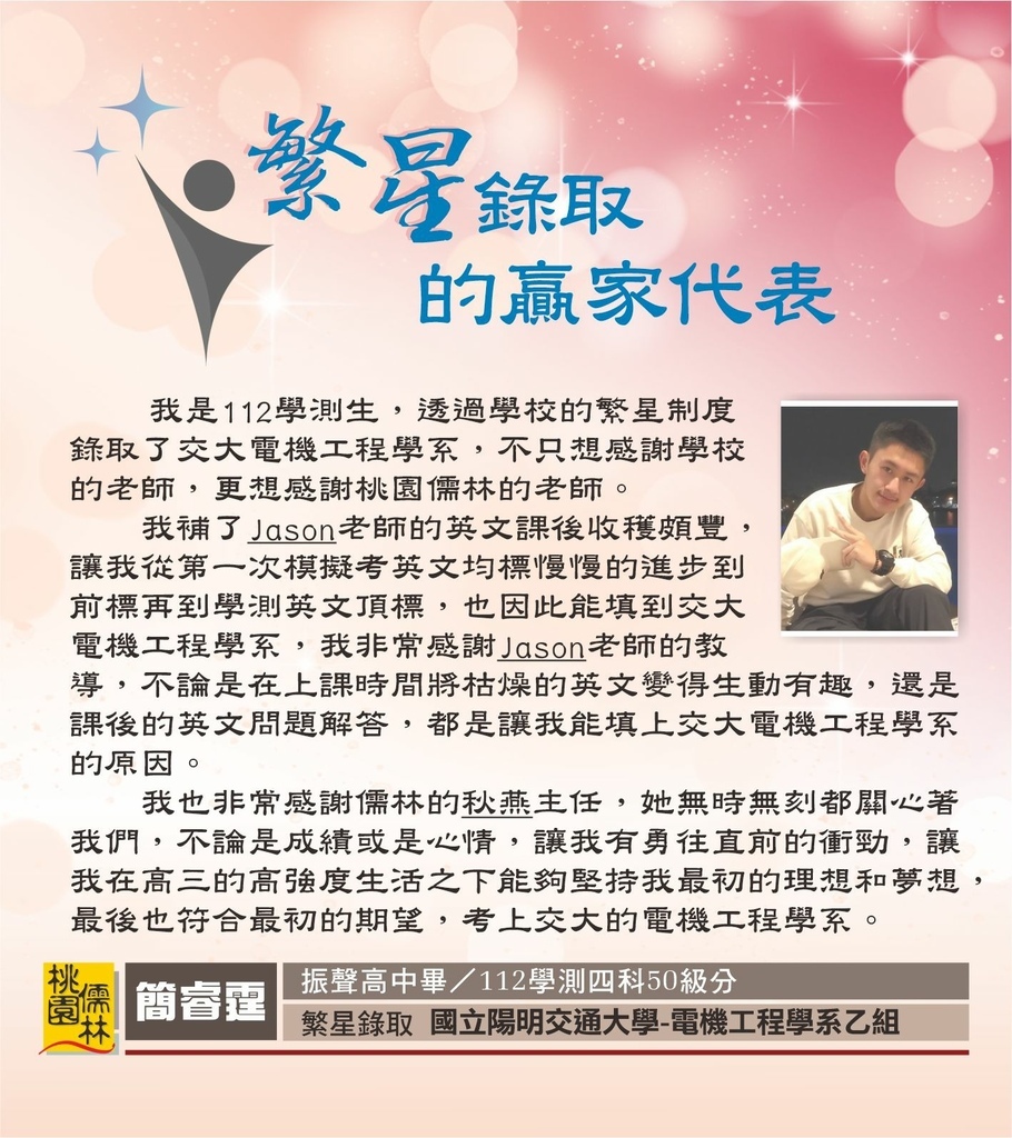 從高二897名到指考考取成大工程科學。主筆:桃園儒林學子楊庭維
