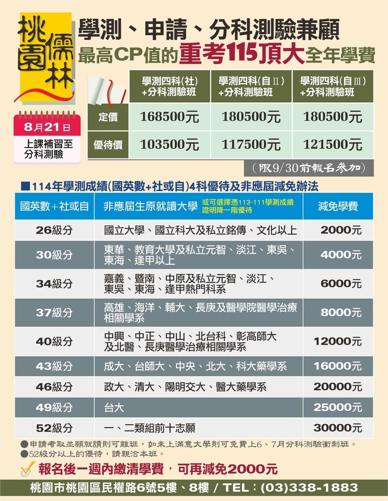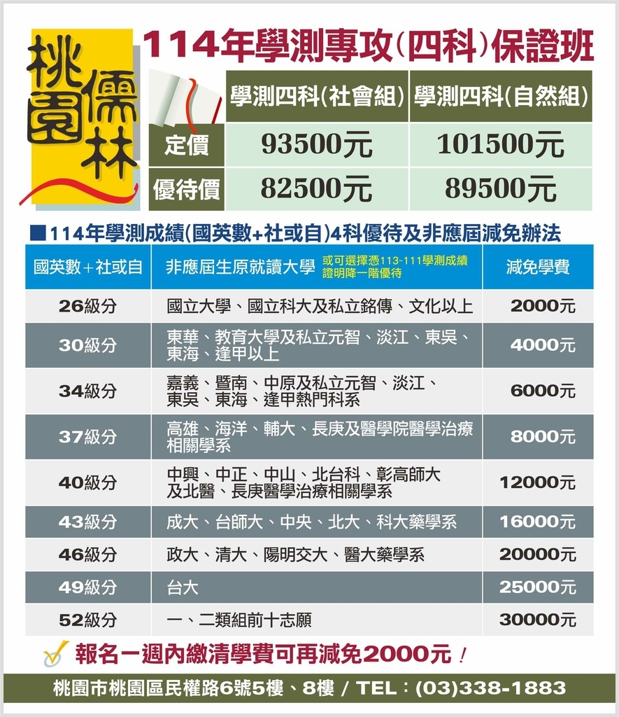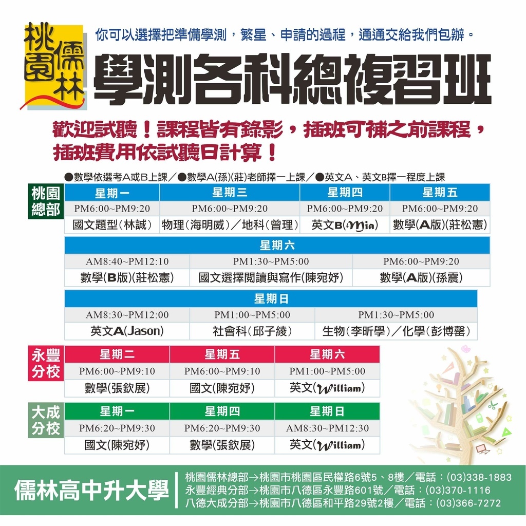 或是親至桃園儒林補習班,班址:桃園市民權路6號5樓。