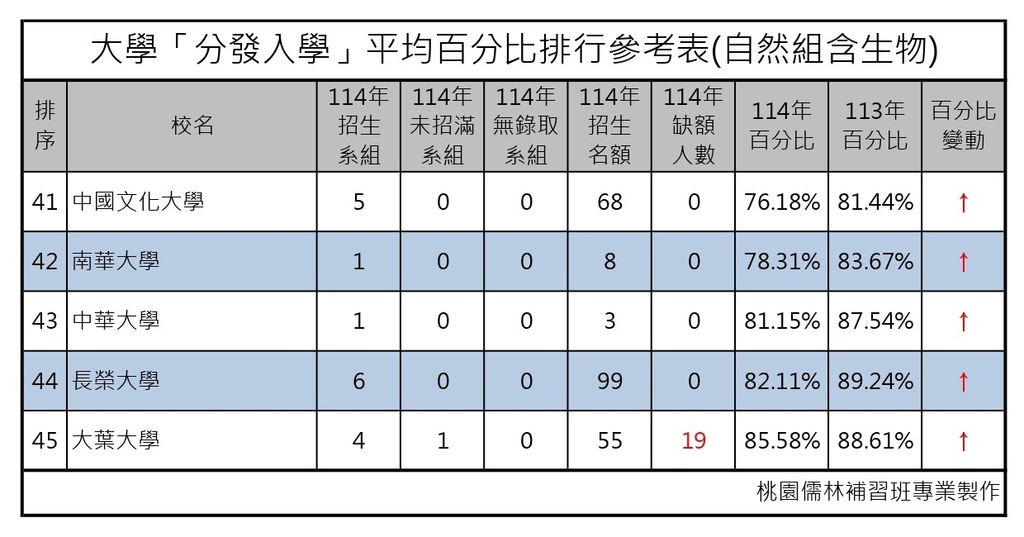 114年平均百分比「7.67 %」較113年的「8.47 %」小,代表變得相對難上,我們也用箭頭"↑"表示難度上升。